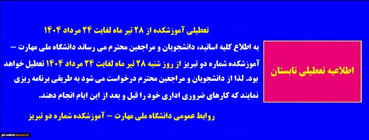 اطلاعیه تعطیلی آموزشکده از 28 تیر ماه لغایت 24مرداد 1404