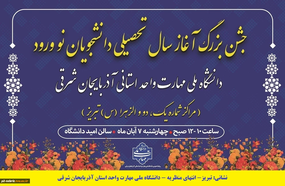 جشن بزرگ آغاز سال تحصیلی دانشجویان نو ورود دانشگاه ملی مهارت واحد استانی آذربایجان شرقی ( مراکز شماره 1، 2 و الزهرا (س) چهارشنبه 30 مهر 1404 ساعت 10:55
