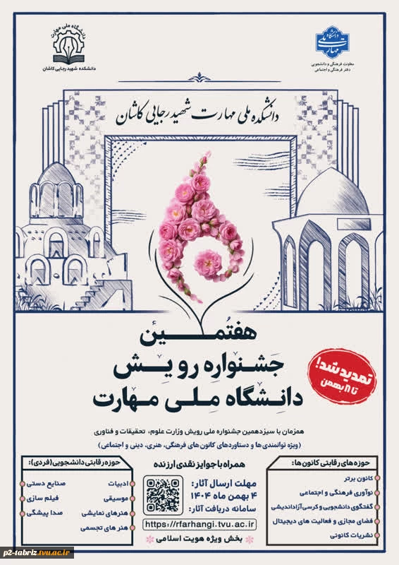 هفتمین جشنواره رویش دانشگاه ملی مهارت (ویژه دستاوردهای کانون های فرهنگی، هنری و اجتماعی) تا 8 بهمن تمدید شد چهارشنبه 24 دی 1404 ساعت 10:23
